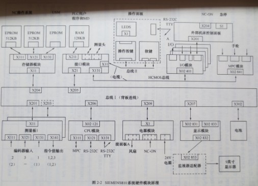 ?SIEMENS 810T/M系統的硬件結構緊湊,整體體積僅相當于放一臺14英寸電視機。圖2-1為系統背面示意圖,主要部件原理框圖如圖2-2所示。
