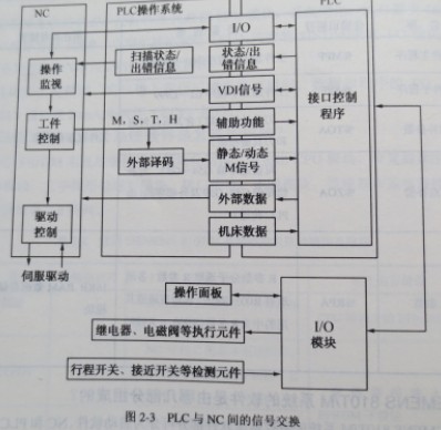 ????SIEMENS 810T/M“系統自帶一個集成式PLC,用于實現系統與機床的接口和電氣邏輯控制。集成式PLC就是數控裝置沒有單獨的PLC的CPU,硬件上與NC不能分離,不屬于某型號的PLC與NC實現接口或者通信而構成系統的模式.編程語言采用SIEMENS SIMATIC S5系列PLC的語言STEPS. PLC與NC間的信號交換如圖2-3所示。